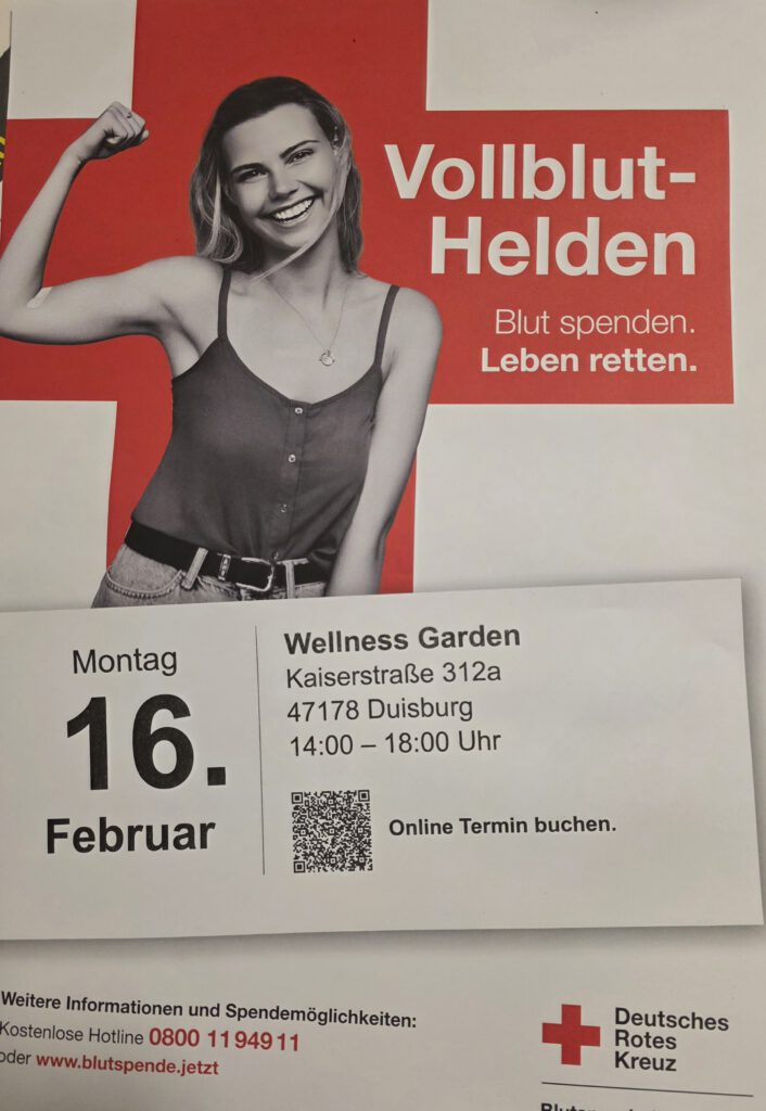 Blut spenden rettet Leben! Blutspendenaktion in unserem großen Kursraum. Veranstalter ist das Deutsche Rote Kreuz: (Rosen-)Montag, 16. Februar, 14 bis 18 Uhr. Unser Kursprogramm entfällt.